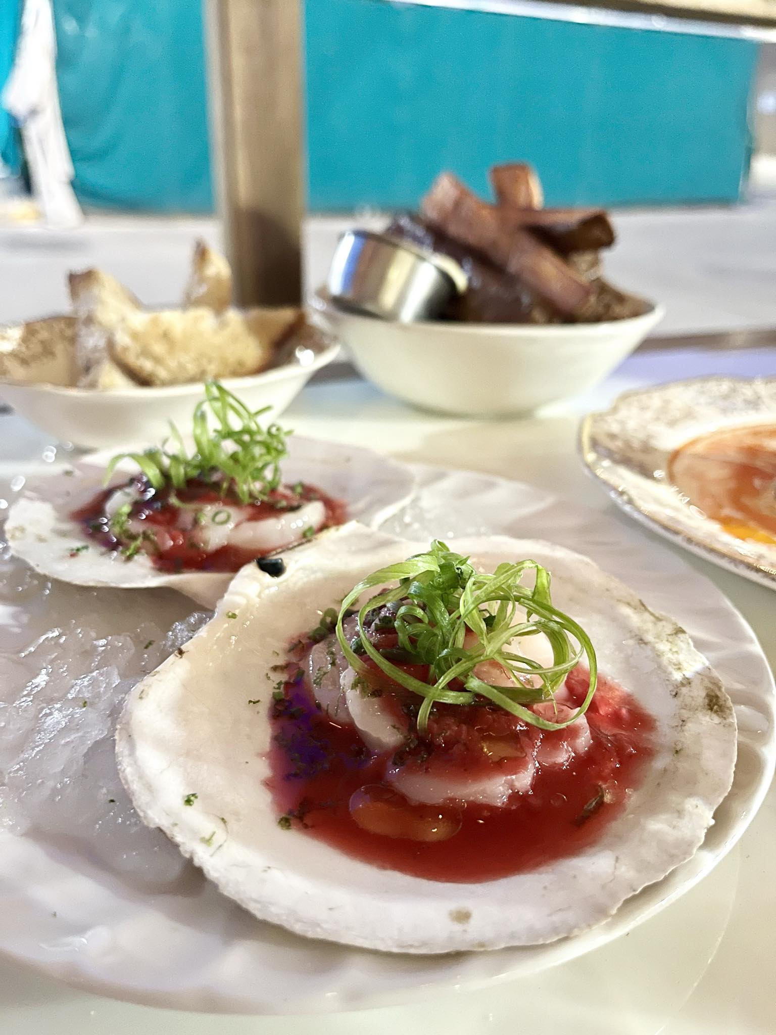 On a débuté avec un plateau d’huîtres et on a opté pour l’option assortiments où on pouvait retrouver un peu de tout : tatamabouche, opus, caribou, chebooktoock. Elles étaient toutes délicieuses. On a accompagné le tout d’un cocktail, pour ma part je me suis laissé tenté par un Campari et Melissa un Spritz. On était heureuse de se faire un cheers au début de l’été et du beau temps !