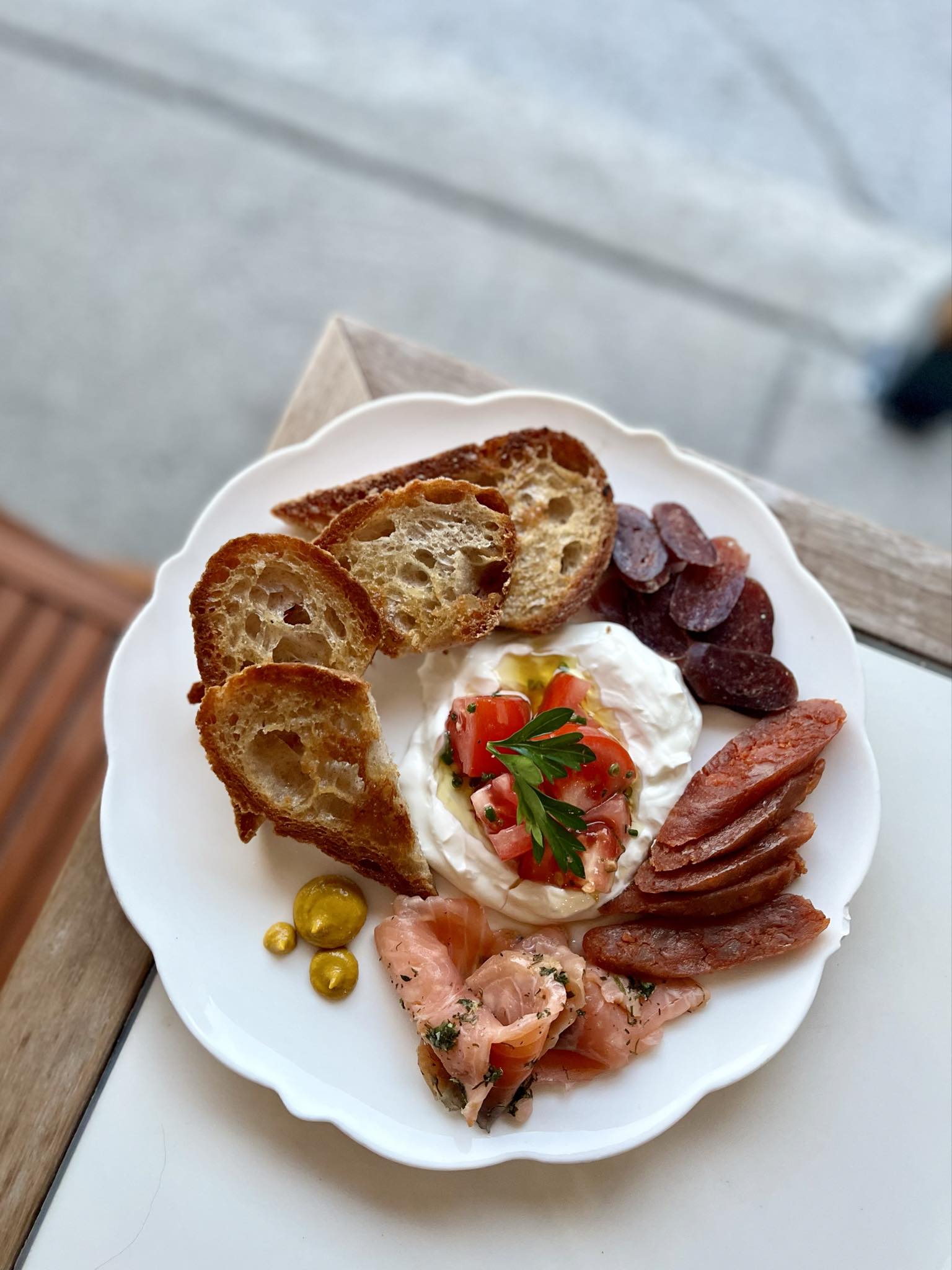 Pour notre 2e service, on a commandé la planche de charcuterie de la mer, c’était vraiment intriguant. Il y avait du saumon fumé et deux autres types de charcuteries du moment. Le menu peut changer en fonction des arrivages de poissons et fruits de mer. Je ne me souviens plus précisément du type de poisson, mais c’était apprêté comme un pepperoni et c’était vraiment très bon.