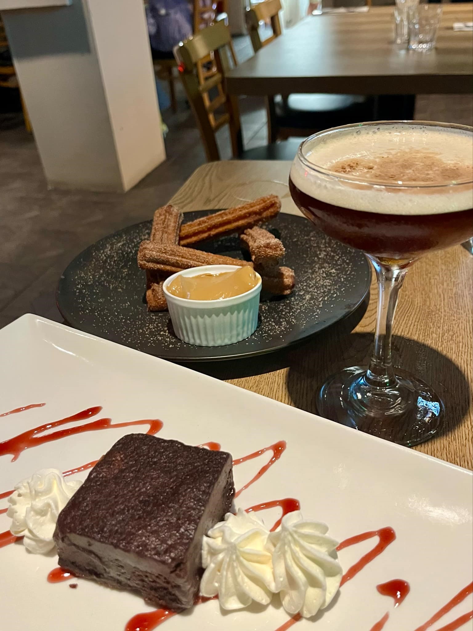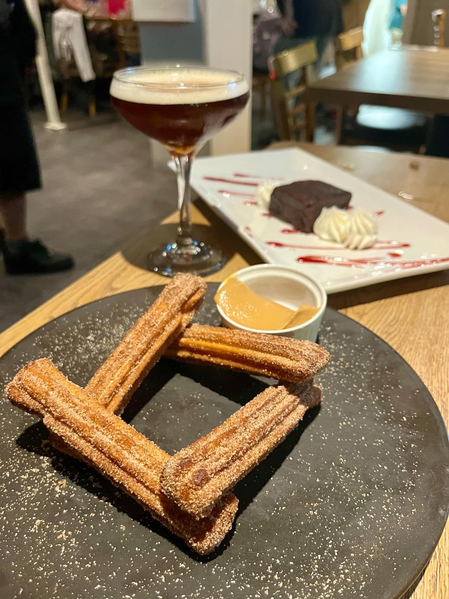 Nous étions déjà rassasiés, mais on voulait tout de même vivre l’expérience jusqu’au bout avec les desserts. On a donc opté pour des Churros et un brownie. C’était D-É-C-A-D-E-N-T. Pour accompagner nos desserts, on s’est commandés des Espresso martini (Ketel One Vodka, Kahlua, sirop simple, Espresso). C’était la première fois que je goûtais à ce cocktail et je confirme que j’ai eu un immense coup de cœur. J’ai d’ailleurs mis sur ma liste d’épicerie tout ce qu’il faut pour m’en faire à la maison.