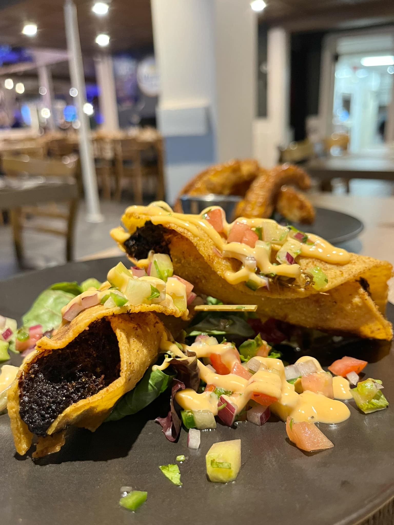 - Taquitos (Pulled pork, salsa de tomatillos, mix de fromage maison, crème sure)