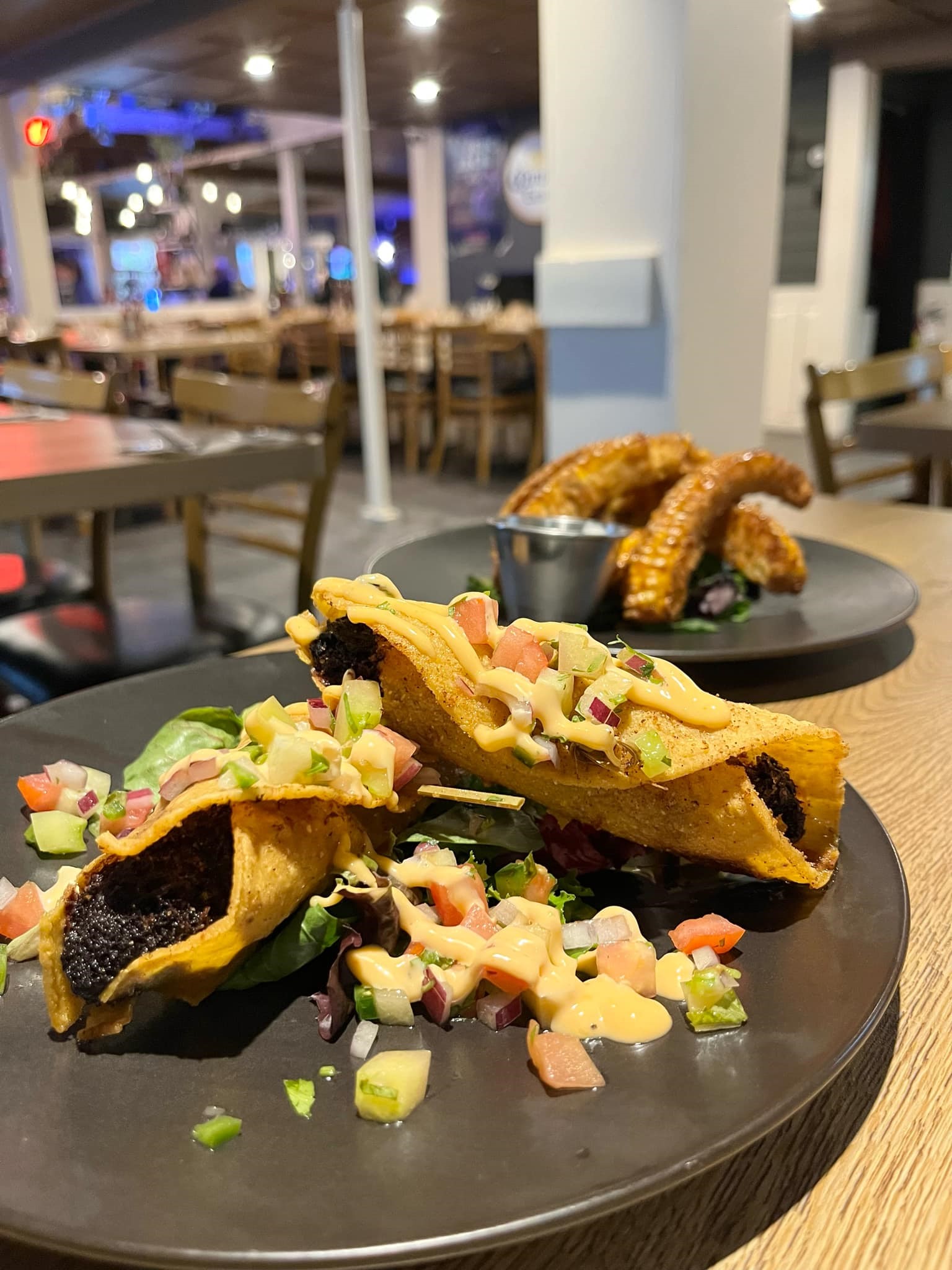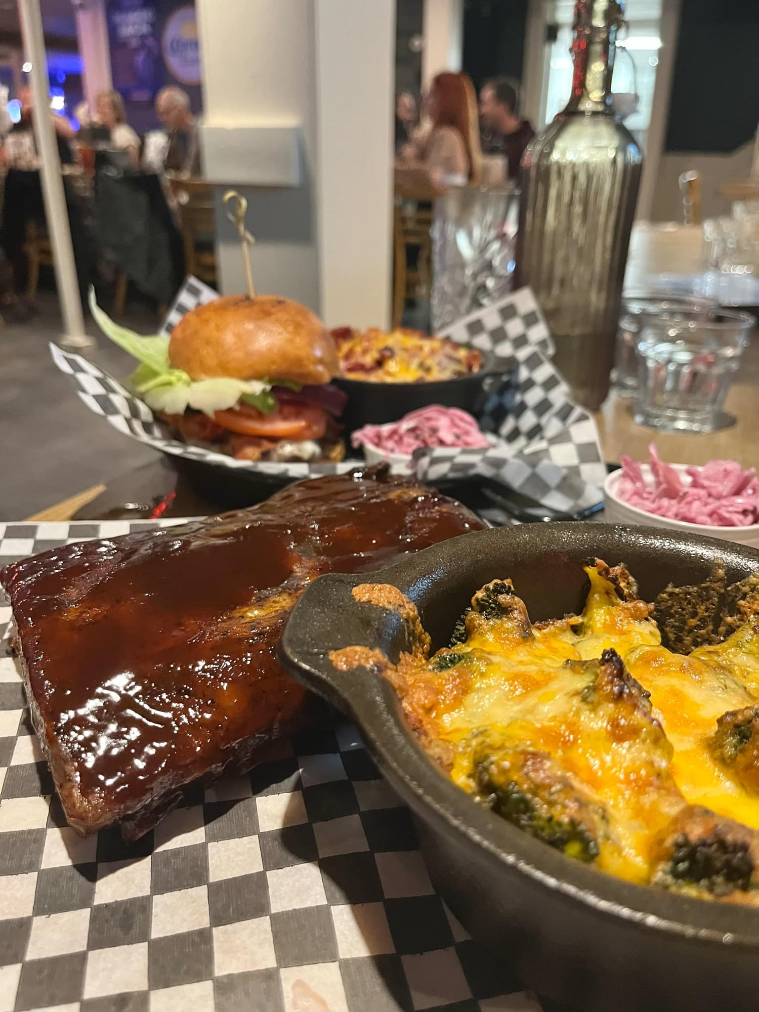 Dès qu’on arrive devant l’édifice on a l’impression d’être avalé par l’univers du Jack Saloon, l’ambiance est vraiment contagieuse. En se rendant à notre table, je ne pouvais m’empêcher de regarder chaque détail. Le petit grincement de plancher sous mes pieds, les murs un peu vieillot, les néons et les affiches partout, c’est vraiment un bel endroit.