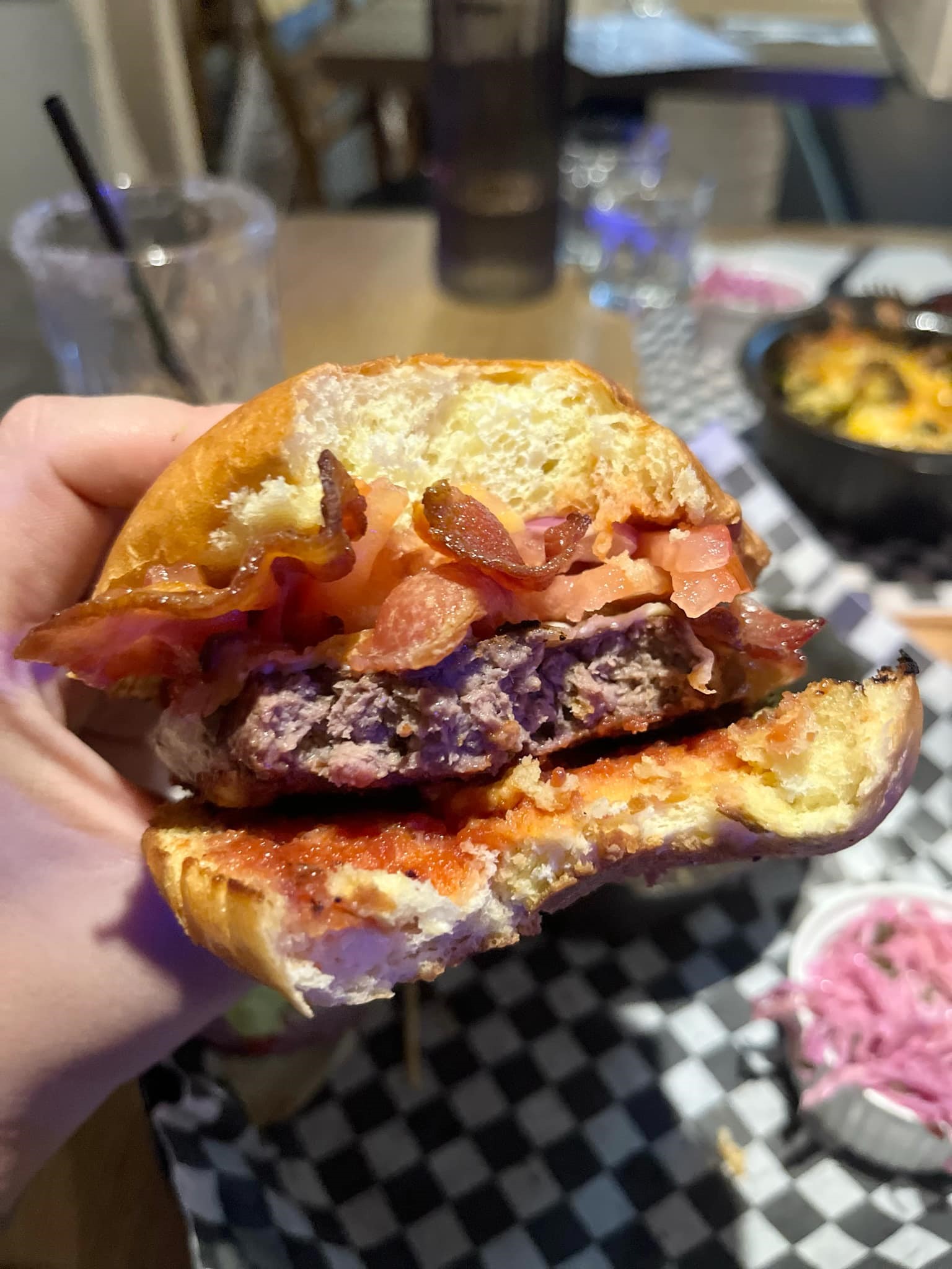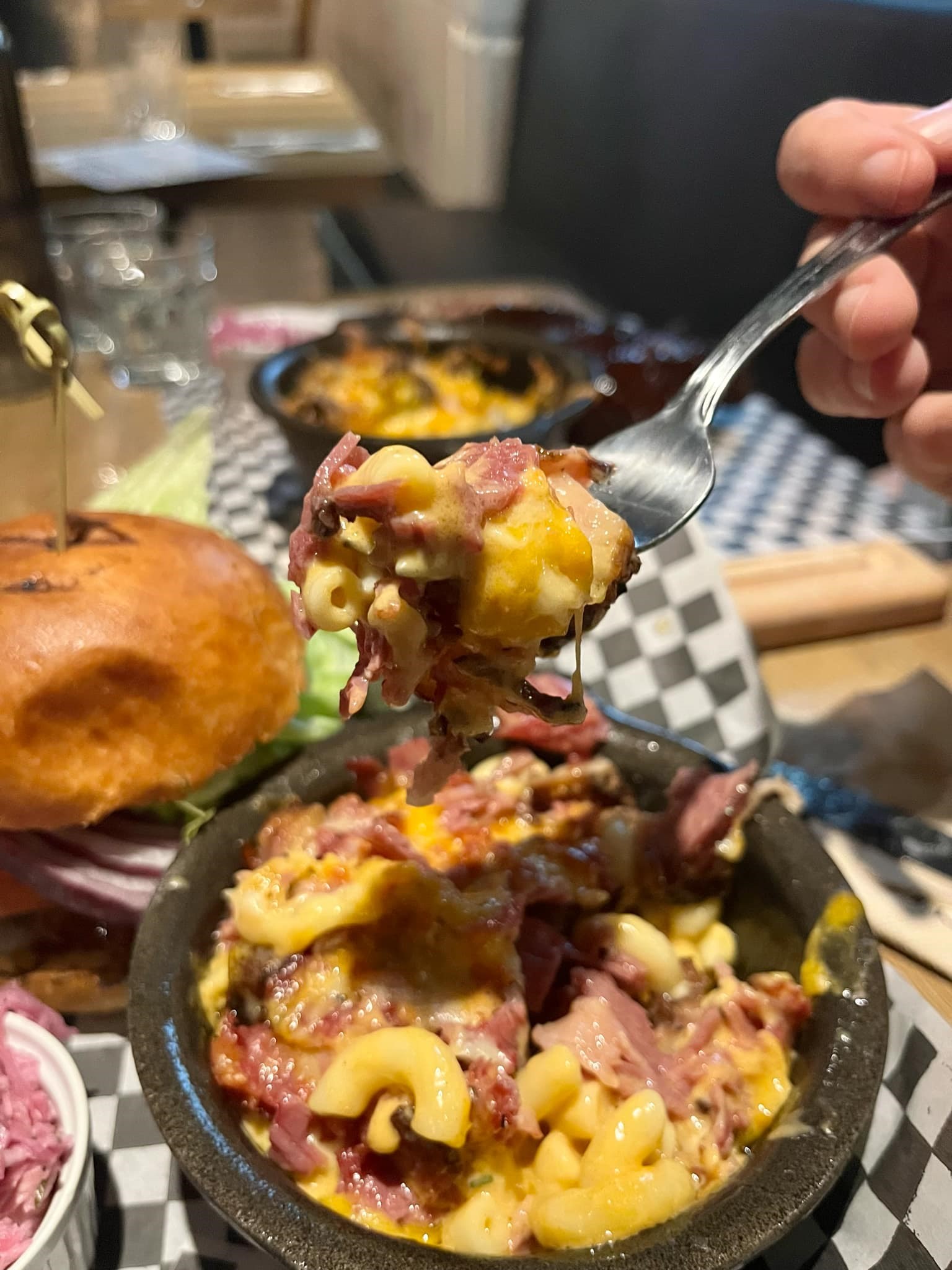 Bon, je l’ai dit plus haut, j’ai malheureusement pas reçu la bonne assiette, j’avais au préalable commandé le Stockmen Australien (Pain brioché, galette de bœuf, fromage de chèvre, betteraves marinées, épinards, tomate, oignons rouges, mayonnaise aux bleuets) principalement parce que le mélange des saveurs criaient mon nom. Mais j’ai finalement reçu l’Américain, un peu plus classique. Mais je ne suis pas fâchée, je peux tout de même confirmer que la qualité de la viande est parfaite. J’ai également eu un petit extra dans mon mac & cheese que j’avais demandé classique, mais celui-ci avait du smoked meet : AYOYE. Celui-ci était absolument délicieux, il était tendre et vraiment goûteux comme j’aime.