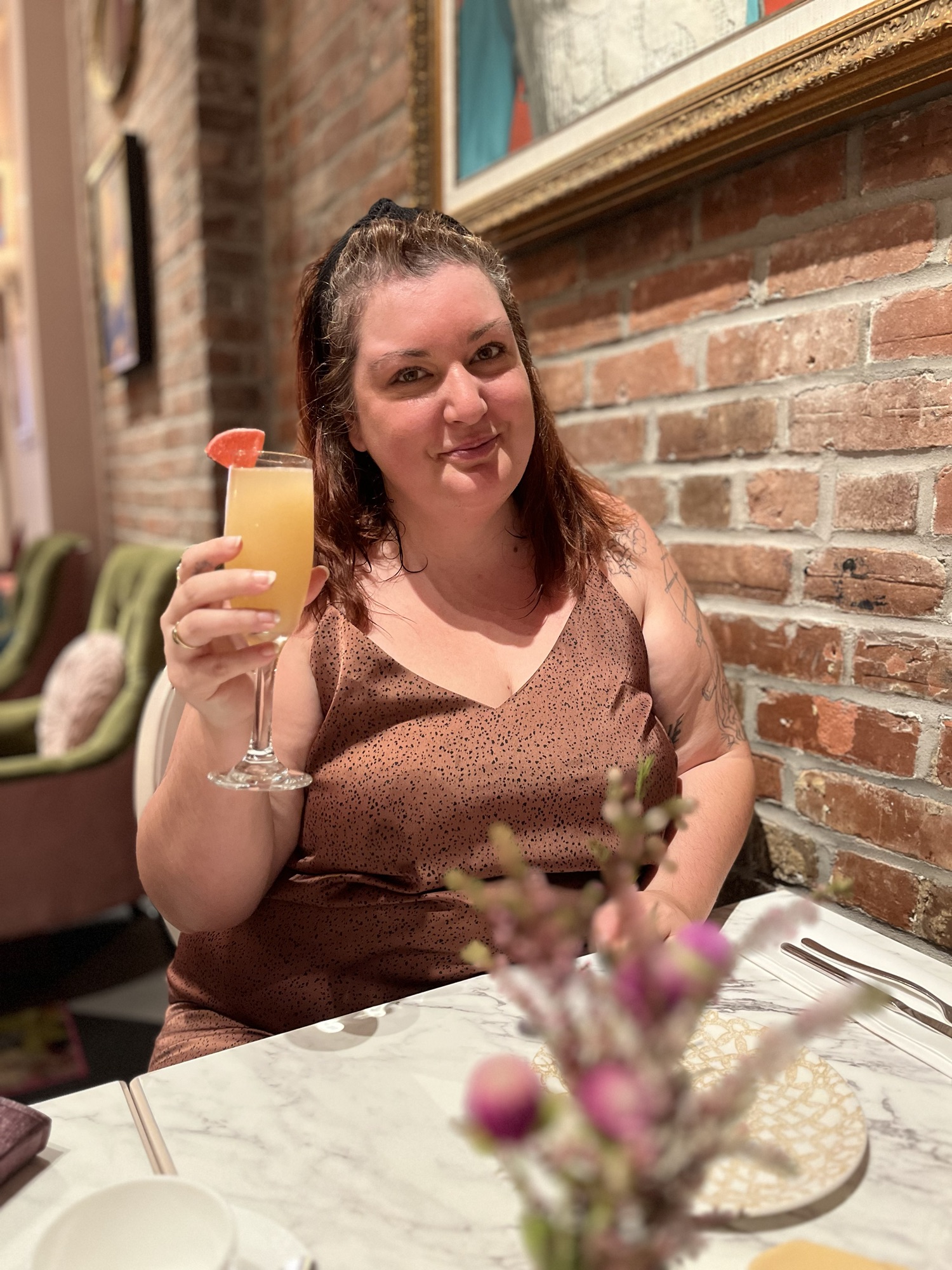 Revenons en septembre dernier où, avec mes deux amies, j’ai vécu l’expérience du thé à l’anglaise pour la première fois. Il y a un menu avec la liste de tout ce qui nous est servi. Une chose à savoir, c’est qu’il est possible de modifier un peu celui-ci si vous avez des allergies ou des intolérances. Il y a également une version végétarienne et même végane. Nous avons toutes les trois optés pour le menu régulier et voici ce qui nous a été servi. Une des propriétaires est venue nous rencontrer pour nous expliquer le concept ainsi que le menu. Elle nous a également offert un petit mimosa prosecco-poire qui était délicieux.