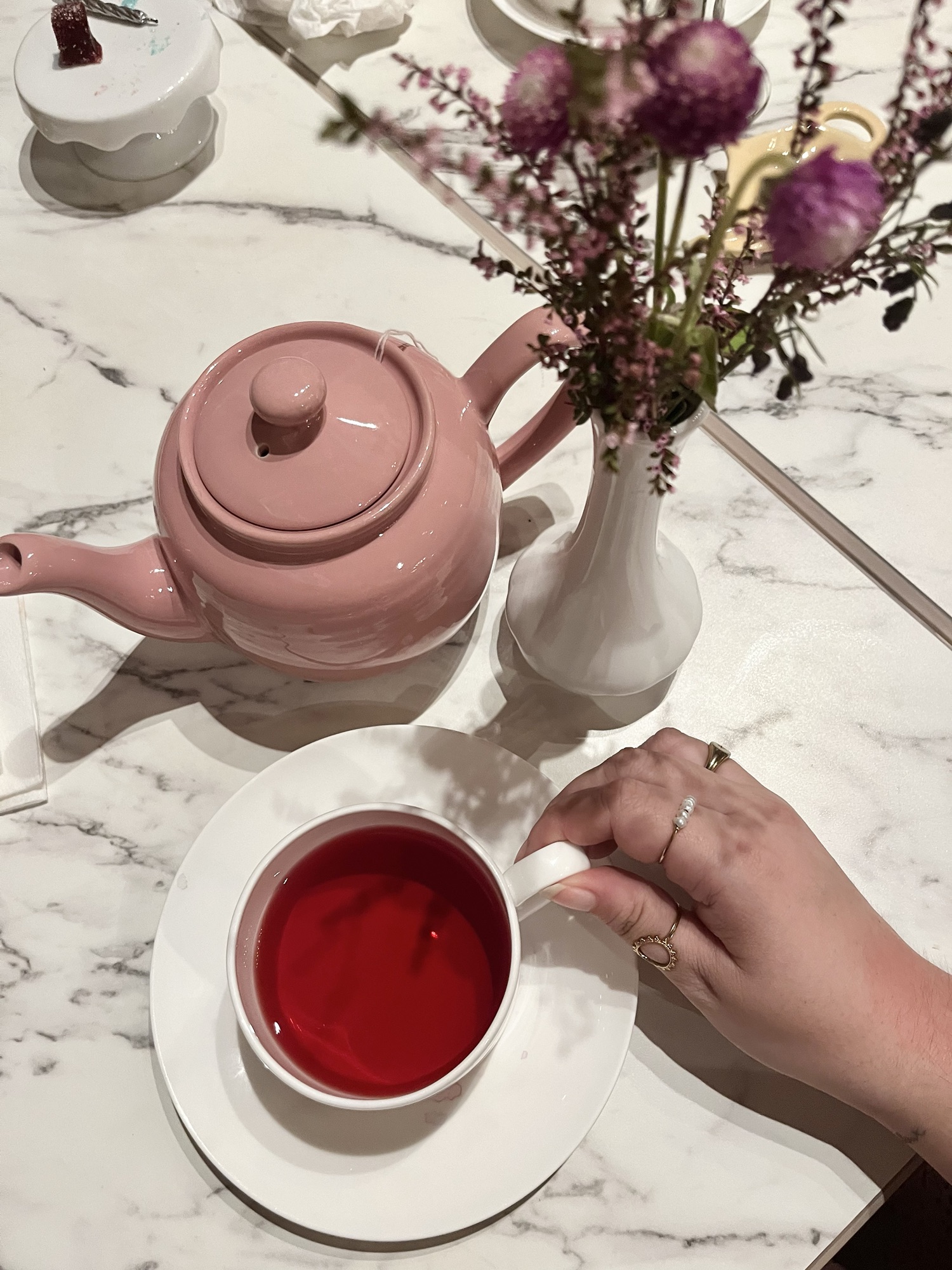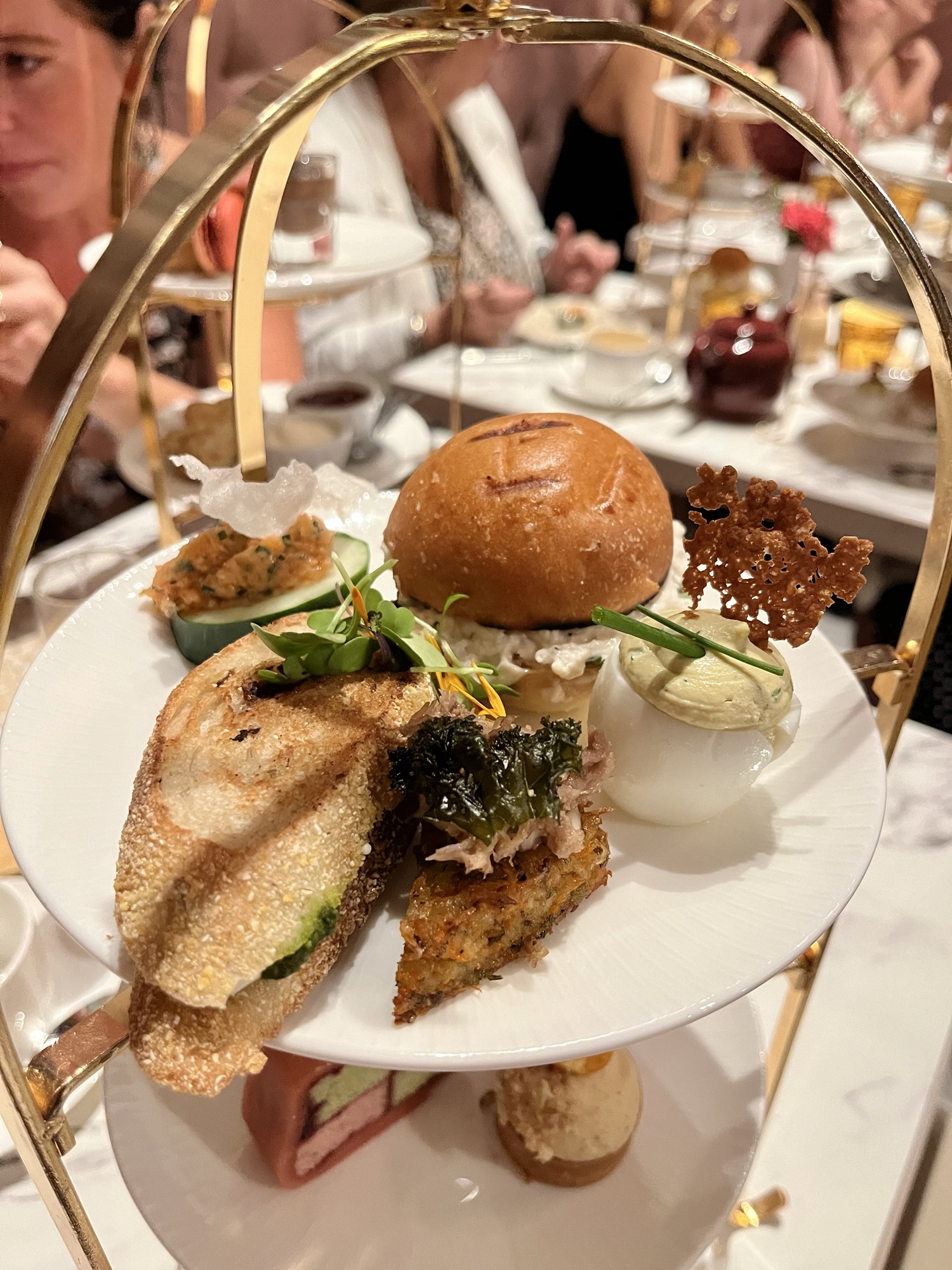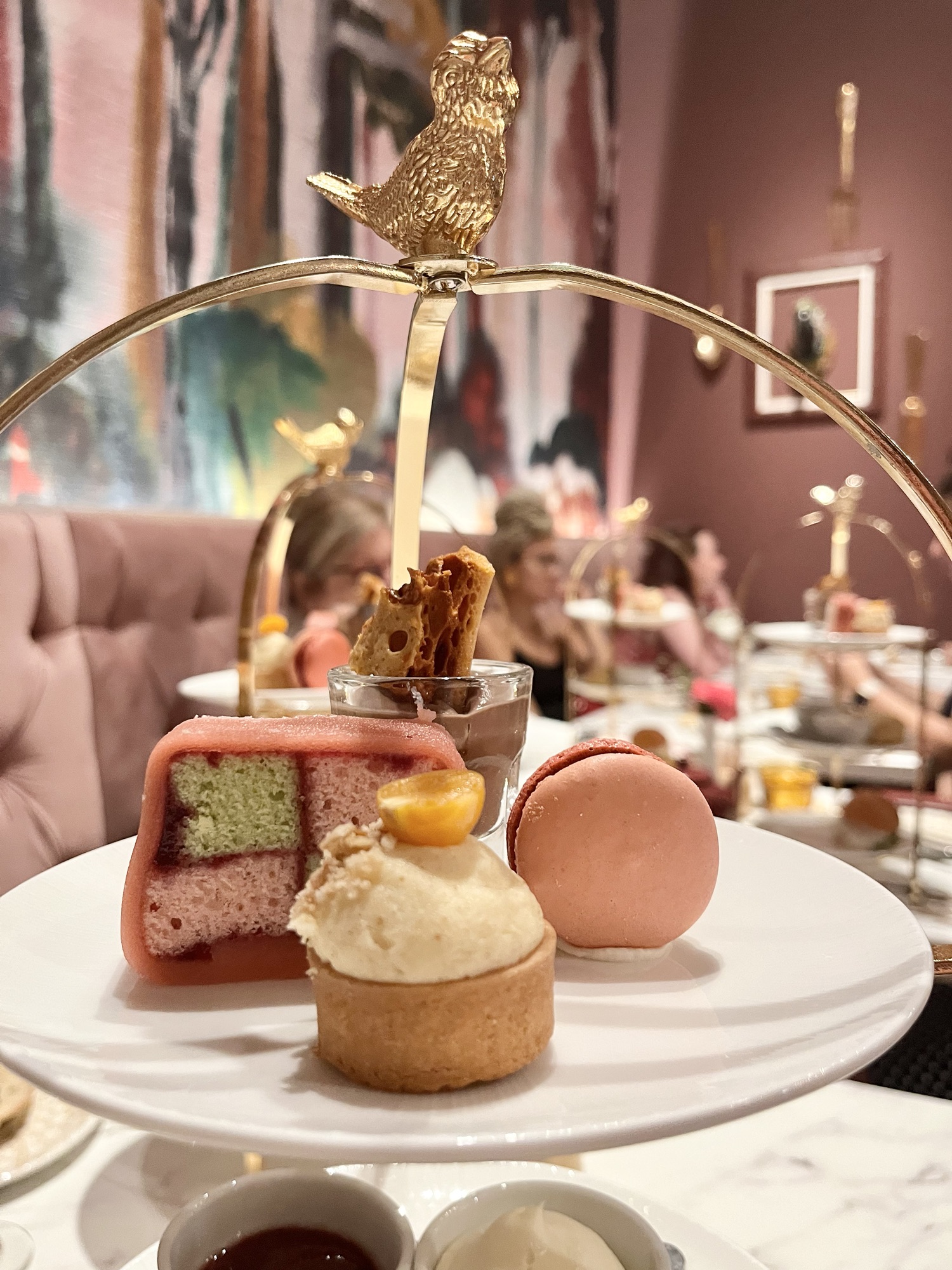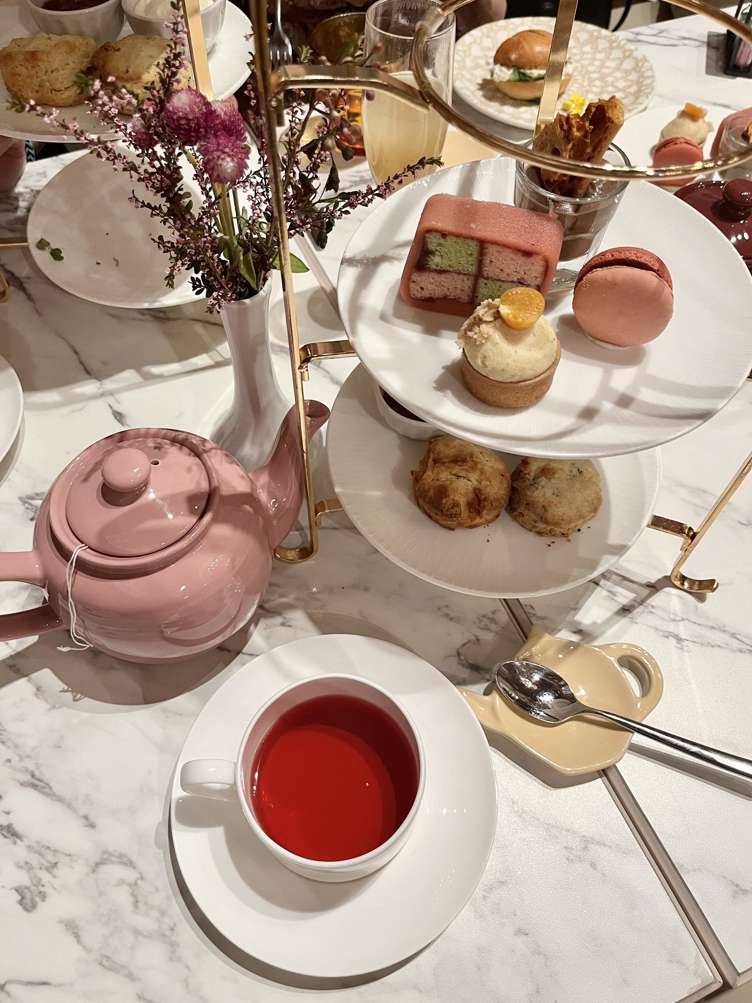 En plus du plateau trois étages par personne, nous pouvons choisir le thé de notre choix. Celui-ci est servi dans une théière individuelle. Pour ma part, j’ai opté pour le thé « secret sucré » qui est un mélange judicieux de pomme, d’orange et de fleurs offrant des reflets crémeux de vanille.
